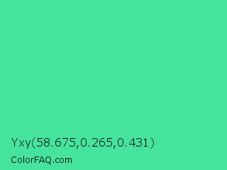 Yxy 58.675,0.265,0.431 Color is a normal green color and the nearest color is Eucalyptus #44d7a8. Hex code #46e39d and RGB value is rgb(70,227,157). In RGB color space, this color is composed of 27% red, 89% green, 62% blue, In CMYK color space, this color is composed of 69% cyan, 0% magenta, 31% yellow , 11% black , In HSL color space, this color has a hue angle of 153° , 74% saturation and 58% lightness.