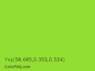 Yxy 58.685,0.353,0.534 Color is a normal green color and the nearest color is Kiwi #8ee53f. Hex code #93de33 and RGB value is rgb(147,222,51). In RGB color space, this color is composed of 58% red, 87% green, 20% blue, In CMYK color space, this color is composed of 34% cyan, 0% magenta, 77% yellow , 13% black , In HSL color space, this color has a hue angle of 86° , 72% saturation and 54% lightness.