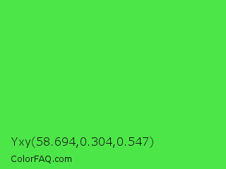 Yxy 58.694,0.304,0.547 Color is a normal green color and the nearest color is Lime Green #32cd32. Hex code #4de649 and RGB value is rgb(77,230,73). In RGB color space, this color is composed of 30% red, 90% green, 29% blue, In CMYK color space, this color is composed of 67% cyan, 0% magenta, 68% yellow , 10% black , In HSL color space, this color has a hue angle of 118° , 76% saturation and 59% lightness.