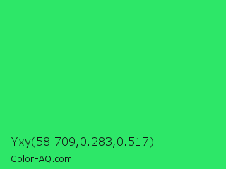 Yxy 58.709,0.283,0.517 Color is a normal green color and the nearest color is UFO Green #3cd070. Hex code #2de768 and RGB value is rgb(45,231,104). In RGB color space, this color is composed of 18% red, 91% green, 41% blue, In CMYK color space, this color is composed of 81% cyan, 0% magenta, 55% yellow , 9% black , In HSL color space, this color has a hue angle of 139° , 79% saturation and 54% lightness.