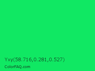 Yxy 58.716,0.281,0.527 Color is a normal green color and the nearest color is Malachite #0bda51. Hex code #10e863 and RGB value is rgb(16,232,99). In RGB color space, this color is composed of 6% red, 91% green, 39% blue, In CMYK color space, this color is composed of 93% cyan, 0% magenta, 57% yellow , 9% black , In HSL color space, this color has a hue angle of 143° , 87% saturation and 49% lightness.