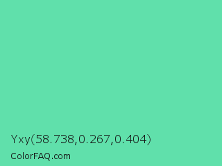 Yxy 58.738,0.267,0.404 Color is a light green color and the nearest color is Medium Aquamarine #66ddaa. Hex code #60e0ab and RGB value is rgb(96,224,171). In RGB color space, this color is composed of 38% red, 88% green, 67% blue, In CMYK color space, this color is composed of 57% cyan, 0% magenta, 24% yellow , 12% black , In HSL color space, this color has a hue angle of 155° , 67% saturation and 63% lightness.
