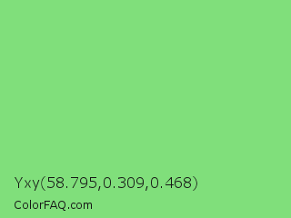 Yxy 58.795,0.309,0.468 Color is a light green color and the nearest color is Pastel Green #77dd77. Hex code #80df7b and RGB value is rgb(128,223,123). In RGB color space, this color is composed of 50% red, 87% green, 48% blue, In CMYK color space, this color is composed of 43% cyan, 0% magenta, 45% yellow , 13% black , In HSL color space, this color has a hue angle of 117° , 61% saturation and 68% lightness.