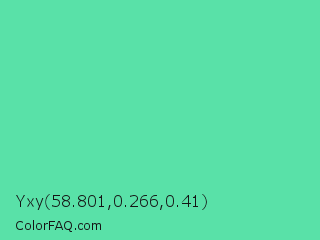 Yxy 58.801,0.266,0.41 Color is a light green color and the nearest color is Medium Aquamarine #66ddaa. Hex code #59e1a8 and RGB value is rgb(89,225,168). In RGB color space, this color is composed of 35% red, 88% green, 66% blue, In CMYK color space, this color is composed of 60% cyan, 0% magenta, 25% yellow , 12% black , In HSL color space, this color has a hue angle of 155° , 69% saturation and 62% lightness.