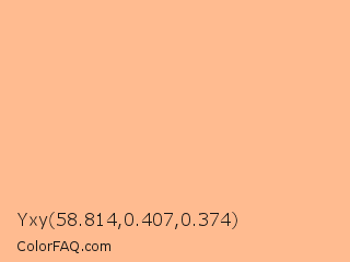 Yxy 58.814,0.407,0.374 Color is a light orange color and the nearest color is Macaroni And Cheese #ffbd88. Hex code #ffbb90 and RGB value is rgb(255,187,144). In RGB color space, this color is composed of 100% red, 73% green, 56% blue, In CMYK color space, this color is composed of 0% cyan, 27% magenta, 44% yellow , 0% black , In HSL color space, this color has a hue angle of 23° , 100% saturation and 78% lightness.