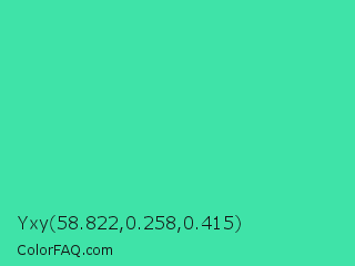 Yxy 58.822,0.258,0.415 Color is a normal green color and the nearest color is Eucalyptus #44d7a8. Hex code #3fe3a8 and RGB value is rgb(63,227,168). In RGB color space, this color is composed of 25% red, 89% green, 66% blue, In CMYK color space, this color is composed of 72% cyan, 0% magenta, 26% yellow , 11% black , In HSL color space, this color has a hue angle of 158° , 75% saturation and 57% lightness.