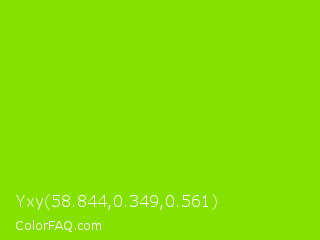 Yxy 58.844,0.349,0.561 Color is a normal green color and the nearest color is Alien Armpit #84de02. Hex code #85e100 and RGB value is rgb(133,225,0). In RGB color space, this color is composed of 52% red, 88% green, 0% blue, In CMYK color space, this color is composed of 41% cyan, 0% magenta, 100% yellow , 12% black , In HSL color space, this color has a hue angle of 85° , 100% saturation and 44% lightness.