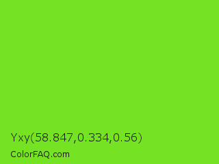 Yxy 58.847,0.334,0.56 Color is a normal green color and the nearest color is Spring Frost #87ff2a. Hex code #75e324 and RGB value is rgb(117,227,36). In RGB color space, this color is composed of 46% red, 89% green, 14% blue, In CMYK color space, this color is composed of 48% cyan, 0% magenta, 84% yellow , 11% black , In HSL color space, this color has a hue angle of 95° , 77% saturation and 52% lightness.