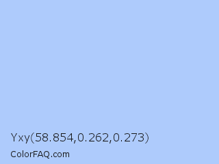 Yxy 58.854,0.262,0.273 Color is a very light blue color and the nearest color is Pale Cornflower Blue #abcdef. Hex code #aecbfc and RGB value is rgb(174,203,252). In RGB color space, this color is composed of 68% red, 80% green, 99% blue, In CMYK color space, this color is composed of 31% cyan, 19% magenta, 0% yellow , 1% black , In HSL color space, this color has a hue angle of 218° , 93% saturation and 84% lightness.