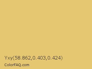 Yxy 58.862,0.403,0.424 Color is a light orange color and the nearest color is Rob Roy #eac674. Hex code #e6c771 and RGB value is rgb(230,199,113). In RGB color space, this color is composed of 90% red, 78% green, 44% blue, In CMYK color space, this color is composed of 0% cyan, 13% magenta, 51% yellow , 10% black , In HSL color space, this color has a hue angle of 44° , 70% saturation and 67% lightness.