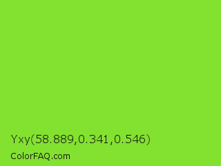 Yxy 58.889,0.341,0.546 Color is a normal green color and the nearest color is Kiwi #8ee53f. Hex code #83e130 and RGB value is rgb(131,225,48). In RGB color space, this color is composed of 51% red, 88% green, 19% blue, In CMYK color space, this color is composed of 42% cyan, 0% magenta, 79% yellow , 12% black , In HSL color space, this color has a hue angle of 92° , 75% saturation and 54% lightness.