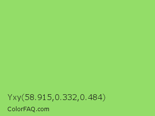 Yxy 58.915,0.332,0.484 Color is a light green color and the nearest color is Pistachio #93c572. Hex code #93dd68 and RGB value is rgb(147,221,104). In RGB color space, this color is composed of 58% red, 87% green, 41% blue, In CMYK color space, this color is composed of 33% cyan, 0% magenta, 53% yellow , 13% black , In HSL color space, this color has a hue angle of 98° , 63% saturation and 64% lightness.