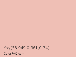 Yxy 58.949,0.361,0.34 Color is a very light red color and the nearest color is Mandys Pink #f2c3b2. Hex code #efbfb5 and RGB value is rgb(239,191,181). In RGB color space, this color is composed of 94% red, 75% green, 71% blue, In CMYK color space, this color is composed of 0% cyan, 20% magenta, 24% yellow , 6% black , In HSL color space, this color has a hue angle of 10° , 64% saturation and 82% lightness.