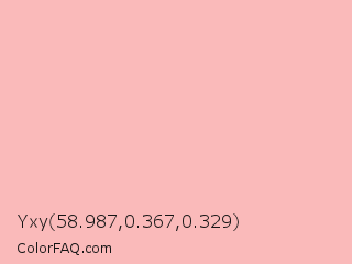 Yxy 58.987,0.367,0.329 Color is a very light red color and the nearest color is Melon #fdbcb4. Hex code #fababa and RGB value is rgb(250,186,186). In RGB color space, this color is composed of 98% red, 73% green, 73% blue, In CMYK color space, this color is composed of 0% cyan, 26% magenta, 26% yellow , 2% black , In HSL color space, this color has a hue angle of 0° , 86% saturation and 85% lightness.