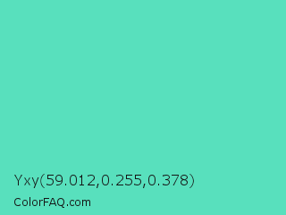 Yxy 59.012,0.255,0.378 Color is a light cyan color and the nearest color is Medium Aquamarine #66ddaa. Hex code #58e0bd and RGB value is rgb(88,224,189). In RGB color space, this color is composed of 35% red, 88% green, 74% blue, In CMYK color space, this color is composed of 61% cyan, 0% magenta, 16% yellow , 12% black , In HSL color space, this color has a hue angle of 165° , 69% saturation and 61% lightness.