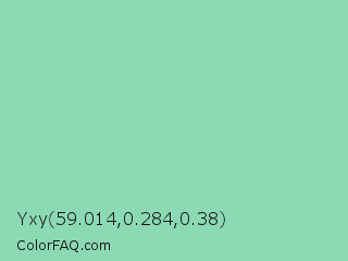 Yxy 59.014,0.284,0.38 Color is a light green color and the nearest color is Vista Blue #8fd6b4. Hex code #8cdab4 and RGB value is rgb(140,218,180). In RGB color space, this color is composed of 55% red, 85% green, 71% blue, In CMYK color space, this color is composed of 36% cyan, 0% magenta, 17% yellow , 15% black , In HSL color space, this color has a hue angle of 151° , 51% saturation and 70% lightness.