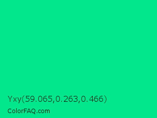 Yxy 59.065,0.263,0.466 Color is a normal green color and the nearest color is Medium Spring Green #00fa9a. Hex code #03e78c and RGB value is rgb(3,231,140). In RGB color space, this color is composed of 1% red, 91% green, 55% blue, In CMYK color space, this color is composed of 99% cyan, 0% magenta, 39% yellow , 9% black , In HSL color space, this color has a hue angle of 156° , 97% saturation and 46% lightness.