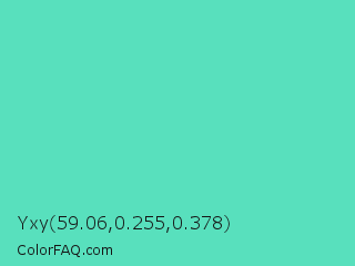 Yxy 59.06,0.255,0.378 Color is a light cyan color and the nearest color is Medium Aquamarine #66ddaa. Hex code #58e0bd and RGB value is rgb(88,224,189). In RGB color space, this color is composed of 35% red, 88% green, 74% blue, In CMYK color space, this color is composed of 61% cyan, 0% magenta, 16% yellow , 12% black , In HSL color space, this color has a hue angle of 165° , 69% saturation and 61% lightness.