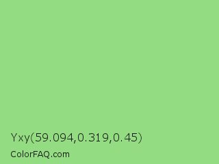 Yxy 59.094,0.319,0.45 Color is a light green color and the nearest color is Feijoa #9fdd8c. Hex code #94dc82 and RGB value is rgb(148,220,130). In RGB color space, this color is composed of 58% red, 86% green, 51% blue, In CMYK color space, this color is composed of 33% cyan, 0% magenta, 41% yellow , 14% black , In HSL color space, this color has a hue angle of 108° , 56% saturation and 69% lightness.
