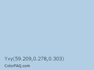 Yxy 59.209,0.278,0.303 Color is a light blue color and the nearest color is Spindle #b6d1ea. Hex code #b1cee4 and RGB value is rgb(177,206,228). In RGB color space, this color is composed of 69% red, 81% green, 89% blue, In CMYK color space, this color is composed of 22% cyan, 10% magenta, 0% yellow , 11% black , In HSL color space, this color has a hue angle of 206° , 49% saturation and 79% lightness.