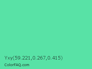 Yxy 59.221,0.267,0.415 Color is a light green color and the nearest color is Medium Aquamarine #66ddaa. Hex code #58e2a6 and RGB value is rgb(88,226,166). In RGB color space, this color is composed of 35% red, 89% green, 65% blue, In CMYK color space, this color is composed of 61% cyan, 0% magenta, 27% yellow , 11% black , In HSL color space, this color has a hue angle of 154° , 70% saturation and 62% lightness.
