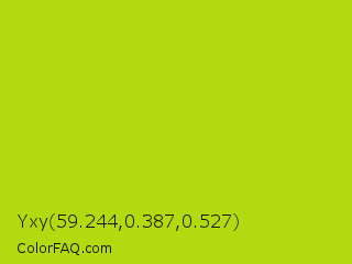 Yxy 59.244,0.387,0.527 Color is a normal lime color and the nearest color is Inch Worm #b0e313. Hex code #b3d911 and RGB value is rgb(179,217,17). In RGB color space, this color is composed of 70% red, 85% green, 7% blue, In CMYK color space, this color is composed of 18% cyan, 0% magenta, 92% yellow , 15% black , In HSL color space, this color has a hue angle of 71° , 85% saturation and 46% lightness.