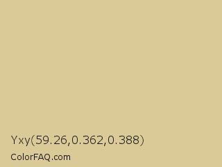 Yxy 59.26,0.362,0.388 Color is a light yellow color and the nearest color is Pavlova #d7c498. Hex code #d9ca98 and RGB value is rgb(217,202,152). In RGB color space, this color is composed of 85% red, 79% green, 60% blue, In CMYK color space, this color is composed of 0% cyan, 7% magenta, 30% yellow , 15% black , In HSL color space, this color has a hue angle of 46° , 46% saturation and 72% lightness.