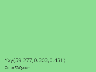 Yxy 59.277,0.303,0.431 Color is a light green color and the nearest color is Light Green #90ee90. Hex code #8bdd92 and RGB value is rgb(139,221,146). In RGB color space, this color is composed of 55% red, 87% green, 57% blue, In CMYK color space, this color is composed of 37% cyan, 0% magenta, 34% yellow , 13% black , In HSL color space, this color has a hue angle of 125° , 55% saturation and 71% lightness.