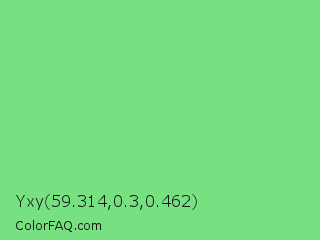 Yxy 59.314,0.3,0.462 Color is a light green color and the nearest color is Pastel Green #77dd77. Hex code #77e182 and RGB value is rgb(119,225,130). In RGB color space, this color is composed of 47% red, 88% green, 51% blue, In CMYK color space, this color is composed of 47% cyan, 0% magenta, 42% yellow , 12% black , In HSL color space, this color has a hue angle of 126° , 64% saturation and 67% lightness.