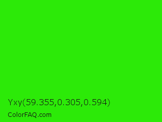Yxy 59.355,0.305,0.594 Color is a normal green color and the nearest color is Neon Green #39ff14. Hex code #2cea08 and RGB value is rgb(44,234,8). In RGB color space, this color is composed of 17% red, 92% green, 3% blue, In CMYK color space, this color is composed of 81% cyan, 0% magenta, 97% yellow , 8% black , In HSL color space, this color has a hue angle of 110° , 93% saturation and 47% lightness.