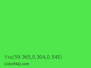 Yxy 59.365,0.304,0.545 Color is a normal green color and the nearest color is Screamin Green #66ff66. Hex code #4fe74b and RGB value is rgb(79,231,75). In RGB color space, this color is composed of 31% red, 91% green, 29% blue, In CMYK color space, this color is composed of 66% cyan, 0% magenta, 68% yellow , 9% black , In HSL color space, this color has a hue angle of 118° , 76% saturation and 60% lightness.