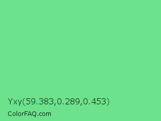 Yxy 59.383,0.289,0.453 Color is a light green color and the nearest color is Very Light Malachite Green #64e986. Hex code #6be28b and RGB value is rgb(107,226,139). In RGB color space, this color is composed of 42% red, 89% green, 55% blue, In CMYK color space, this color is composed of 53% cyan, 0% magenta, 38% yellow , 11% black , In HSL color space, this color has a hue angle of 136° , 67% saturation and 65% lightness.