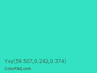 Yxy 59.507,0.242,0.374 Color is a normal cyan color and the nearest color is Turquoise PWG #30d5c8. Hex code #2fe3c3 and RGB value is rgb(47,227,195). In RGB color space, this color is composed of 18% red, 89% green, 76% blue, In CMYK color space, this color is composed of 79% cyan, 0% magenta, 14% yellow , 11% black , In HSL color space, this color has a hue angle of 169° , 76% saturation and 54% lightness.