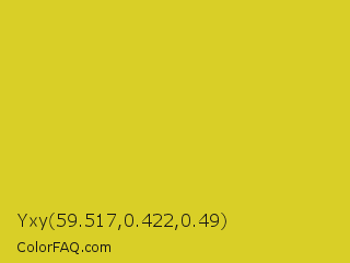 Yxy 59.517,0.422,0.49 Color is a normal yellow color and the nearest color is Sunflower #e4d422. Hex code #d9cf27 and RGB value is rgb(217,207,39). In RGB color space, this color is composed of 85% red, 81% green, 15% blue, In CMYK color space, this color is composed of 0% cyan, 5% magenta, 82% yellow , 15% black , In HSL color space, this color has a hue angle of 57° , 70% saturation and 50% lightness.