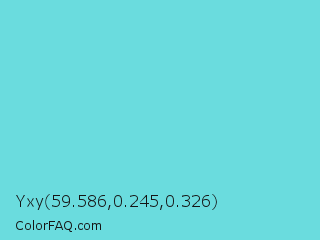 Yxy 59.586,0.245,0.326 Color is a light cyan color and the nearest color is Aquamarine Blue #71d9e2. Hex code #6adcde and RGB value is rgb(106,220,222). In RGB color space, this color is composed of 42% red, 86% green, 87% blue, In CMYK color space, this color is composed of 52% cyan, 1% magenta, 0% yellow , 13% black , In HSL color space, this color has a hue angle of 181° , 64% saturation and 64% lightness.