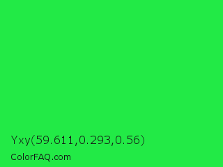 Yxy 59.611,0.293,0.56 Color is a normal green color and the nearest color is Malachite #0bda51. Hex code #22ea46 and RGB value is rgb(34,234,70). In RGB color space, this color is composed of 13% red, 92% green, 27% blue, In CMYK color space, this color is composed of 85% cyan, 0% magenta, 70% yellow , 8% black , In HSL color space, this color has a hue angle of 131° , 83% saturation and 53% lightness.