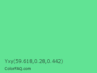 Yxy 59.618,0.28,0.442 Color is a light green color and the nearest color is Very Light Malachite Green #64e986. Hex code #61e394 and RGB value is rgb(97,227,148). In RGB color space, this color is composed of 38% red, 89% green, 58% blue, In CMYK color space, this color is composed of 57% cyan, 0% magenta, 35% yellow , 11% black , In HSL color space, this color has a hue angle of 144° , 70% saturation and 64% lightness.