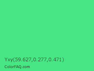 Yxy 59.627,0.277,0.471 Color is a normal green color and the nearest color is Very Light Malachite Green #64e986. Hex code #46e685 and RGB value is rgb(70,230,133). In RGB color space, this color is composed of 27% red, 90% green, 52% blue, In CMYK color space, this color is composed of 70% cyan, 0% magenta, 42% yellow , 10% black , In HSL color space, this color has a hue angle of 144° , 76% saturation and 59% lightness.