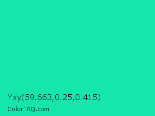 Yxy 59.663,0.25,0.415 Color is a normal green color and the nearest color is Medium Spring Green #00fa9a. Hex code #15e6ab and RGB value is rgb(21,230,171). In RGB color space, this color is composed of 8% red, 90% green, 67% blue, In CMYK color space, this color is composed of 91% cyan, 0% magenta, 26% yellow , 10% black , In HSL color space, this color has a hue angle of 163° , 83% saturation and 49% lightness.