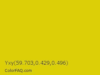 Yxy 59.703,0.429,0.496 Color is a normal yellow color and the nearest color is Citrine #e4d00a. Hex code #dbcf08 and RGB value is rgb(219,207,8). In RGB color space, this color is composed of 86% red, 81% green, 3% blue, In CMYK color space, this color is composed of 0% cyan, 5% magenta, 96% yellow , 14% black , In HSL color space, this color has a hue angle of 57° , 93% saturation and 45% lightness.