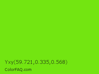 Yxy 59.721,0.335,0.568 Color is a normal green color and the nearest color is Alien Armpit #84de02. Hex code #73e511 and RGB value is rgb(115,229,17). In RGB color space, this color is composed of 45% red, 90% green, 7% blue, In CMYK color space, this color is composed of 50% cyan, 0% magenta, 93% yellow , 10% black , In HSL color space, this color has a hue angle of 92° , 86% saturation and 48% lightness.