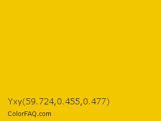 Yxy 59.724,0.455,0.477 Color is a normal yellow color and the nearest color is Yellow Munsell #efcc00. Hex code #f2c700 and RGB value is rgb(242,199,0). In RGB color space, this color is composed of 95% red, 78% green, 0% blue, In CMYK color space, this color is composed of 0% cyan, 18% magenta, 100% yellow , 5% black , In HSL color space, this color has a hue angle of 49° , 100% saturation and 47% lightness.