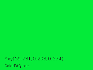 Yxy 59.731,0.293,0.574 Color is a normal green color and the nearest color is Malachite #0bda51. Hex code #03eb39 and RGB value is rgb(3,235,57). In RGB color space, this color is composed of 1% red, 92% green, 22% blue, In CMYK color space, this color is composed of 99% cyan, 0% magenta, 76% yellow , 8% black , In HSL color space, this color has a hue angle of 134° , 97% saturation and 47% lightness.