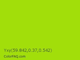 Yxy 59.842,0.37,0.542 Color is a normal lime color and the nearest color is Vivid Lime Green #a6d608. Hex code #a1de0b and RGB value is rgb(161,222,11). In RGB color space, this color is composed of 63% red, 87% green, 4% blue, In CMYK color space, this color is composed of 27% cyan, 0% magenta, 95% yellow , 13% black , In HSL color space, this color has a hue angle of 77° , 91% saturation and 46% lightness.