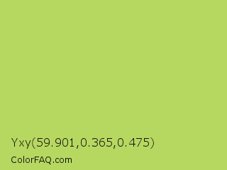 Yxy 59.901,0.365,0.475 Color is a light lime color and the nearest color is June Bud #bdda57. Hex code #b6d860 and RGB value is rgb(182,216,96). In RGB color space, this color is composed of 71% red, 85% green, 38% blue, In CMYK color space, this color is composed of 16% cyan, 0% magenta, 56% yellow , 15% black , In HSL color space, this color has a hue angle of 77° , 61% saturation and 61% lightness.