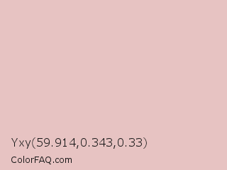 Yxy 59.914,0.343,0.33 Color is a very light red color and the nearest color is Cavern Pink #e3bebe. Hex code #e7c3c2 and RGB value is rgb(231,195,194). In RGB color space, this color is composed of 91% red, 76% green, 76% blue, In CMYK color space, this color is composed of 0% cyan, 16% magenta, 16% yellow , 9% black , In HSL color space, this color has a hue angle of 2° , 44% saturation and 83% lightness.