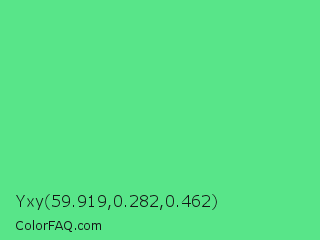 Yxy 59.919,0.282,0.462 Color is a light green color and the nearest color is Very Light Malachite Green #64e986. Hex code #58e589 and RGB value is rgb(88,229,137). In RGB color space, this color is composed of 35% red, 90% green, 54% blue, In CMYK color space, this color is composed of 62% cyan, 0% magenta, 40% yellow , 10% black , In HSL color space, this color has a hue angle of 141° , 73% saturation and 62% lightness.