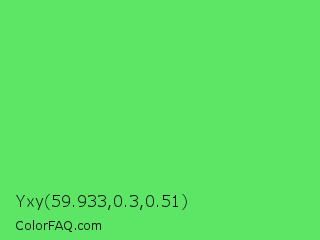 Yxy 59.933,0.3,0.51 Color is a light green color and the nearest color is Screamin Green #66ff66. Hex code #5de666 and RGB value is rgb(93,230,102). In RGB color space, this color is composed of 36% red, 90% green, 40% blue, In CMYK color space, this color is composed of 60% cyan, 0% magenta, 56% yellow , 10% black , In HSL color space, this color has a hue angle of 124° , 73% saturation and 63% lightness.