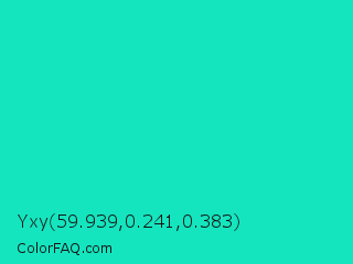 Yxy 59.939,0.241,0.383 Color is a normal cyan color and the nearest color is Turquoise PWG #30d5c8. Hex code #15e5bf and RGB value is rgb(21,229,191). In RGB color space, this color is composed of 8% red, 90% green, 75% blue, In CMYK color space, this color is composed of 91% cyan, 0% magenta, 17% yellow , 10% black , In HSL color space, this color has a hue angle of 169° , 83% saturation and 49% lightness.