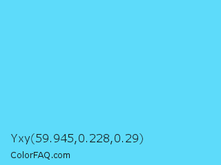 Yxy 59.945,0.228,0.29 Color is a light cyan color and the nearest color is Turquoise Blue #6cdae7. Hex code #5ddbfa and RGB value is rgb(93,219,250). In RGB color space, this color is composed of 36% red, 86% green, 98% blue, In CMYK color space, this color is composed of 63% cyan, 12% magenta, 0% yellow , 2% black , In HSL color space, this color has a hue angle of 192° , 94% saturation and 67% lightness.